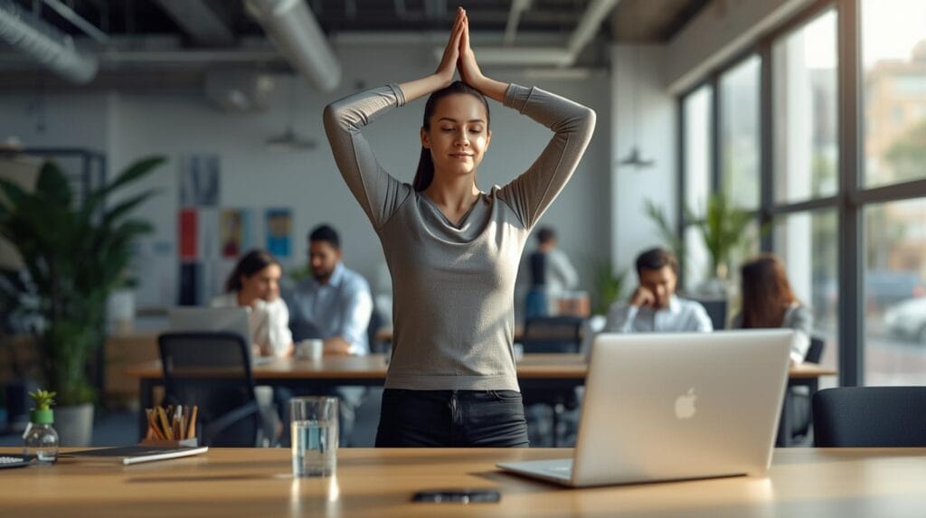 - El «estiramiento ejecutivo»: cada 30 minutos, levántese y estírese hacia el techo. Entrelace los dedos y empuje hacia arriba mientras respira profundamente. Esto abre el pecho y aumenta inmediatamente la entrada de oxígeno.